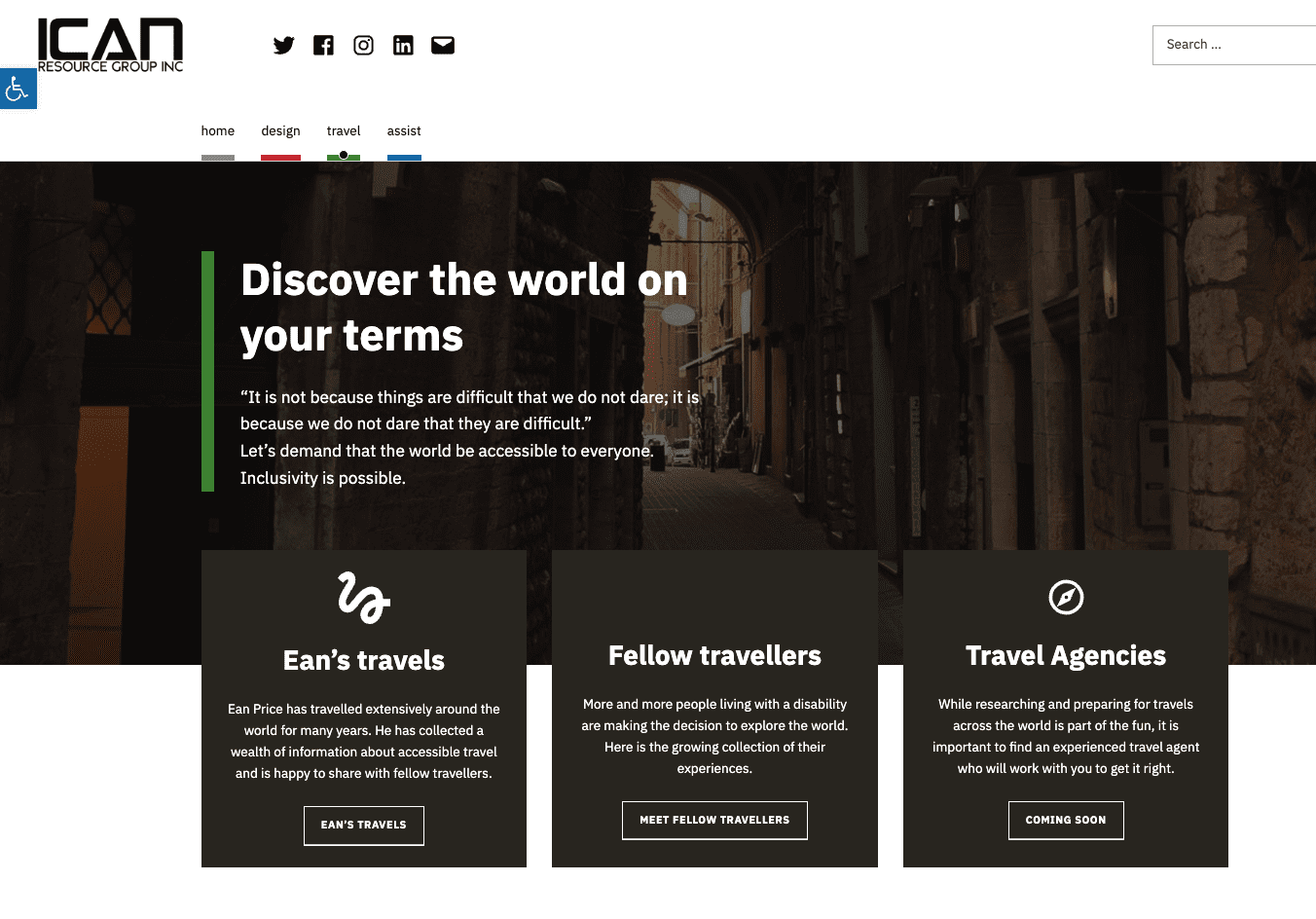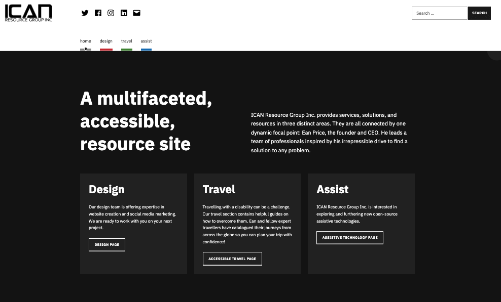 icanresource.ca is a dynamic platform that showcases diverse businesses specializing in branding, website design, and content creation. It also highlights travel stories, opportunities, and invaluable tips for traveling individuals with disabilities. Furthermore, it promotes innovative assistive technology, particularly an automated oral suction device, empowering individuals to regain independence. The website’s black and white branding, subtly complemented by colorful photos, creates a visually appealing experience. Through discreet color coding, each branch of the business is distinct. Overall the site let’s visitors discover a world of creativity, accessibility, and empowerment.